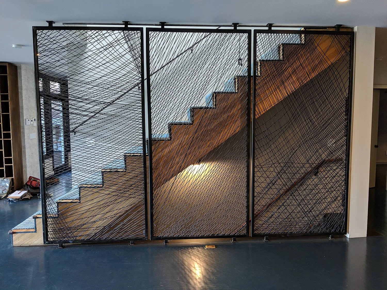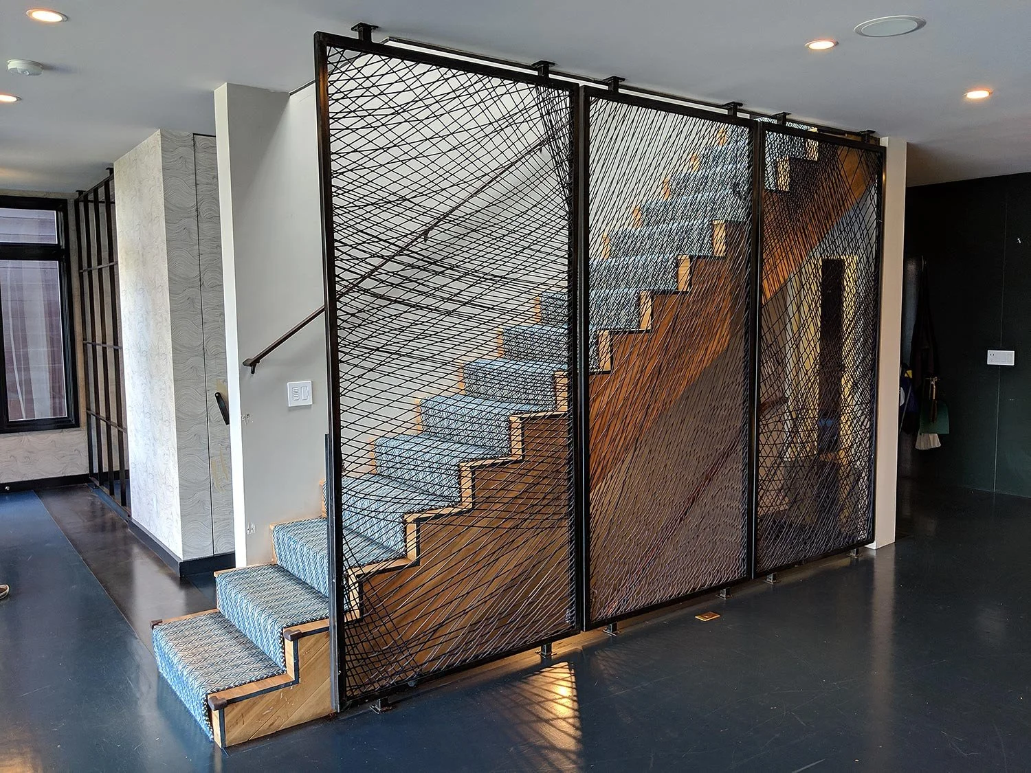 Modern staircase with blue carpeting and black wire mesh design, located in a contemporary interior space.